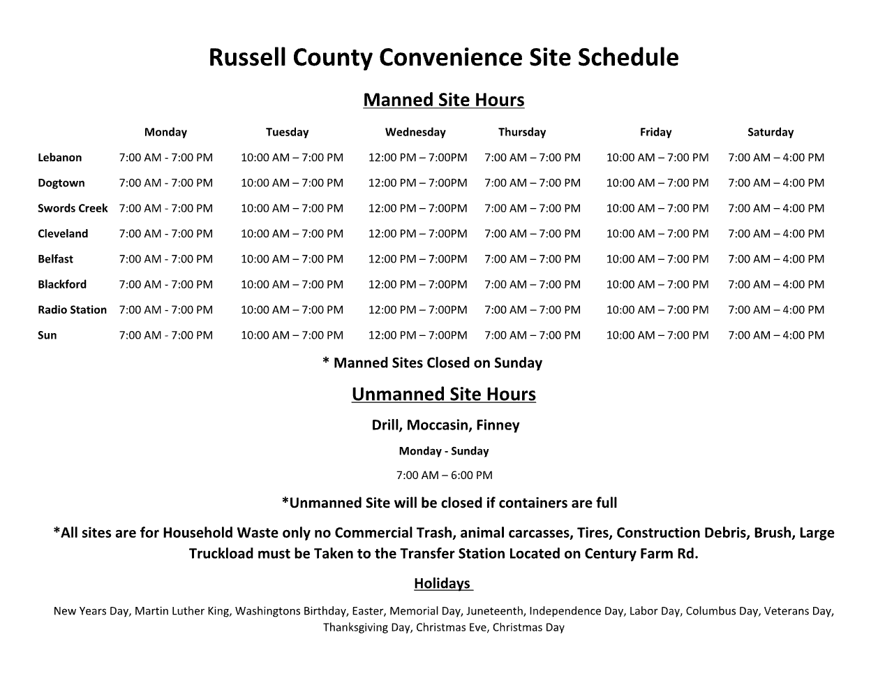 For more information on the solid waste sites schedule, please refer to the Convenience Site Schedule.